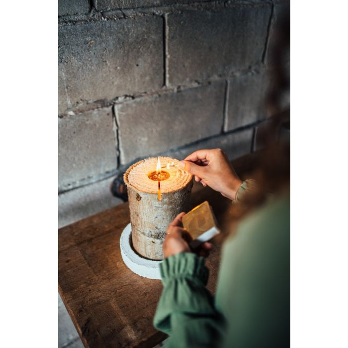In het blok hout zit een kaarsje. Als je dit aansteekt gaat zowel het kaarsje als het hout branden.